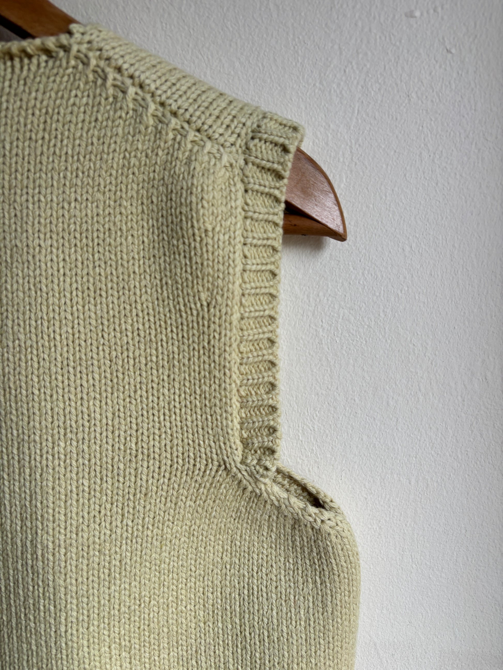 THE LIGHTER SUMMERY VERSION OF THE CLASSIC YETTON VEST. CELEBRATING KNITTINGS FOUNDATIONAL TECHNIQUES WITH A ROLLED HEM AND FASHIONED RIBS.